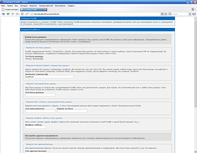 После создания базы и пользователя, поле "Hostname сервера БД" оставьте без изменений, в "Имя базы данных" укажите имя созданной базы данных, например PunBB, поля "Имя пользователя" и "Пароль на базу" заполните в соответствии с заданными для базы, "Префикс таблиц" заполнения не требует.