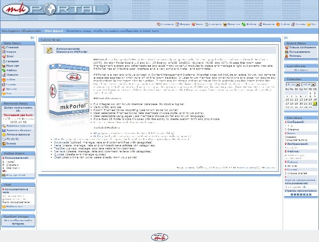 MKPortal - Бесплатная Система Управления Контентом (CMS), которая обеденяется с самыми популярными форумами (Simple Machines, Invision Power Board 1.3 and 2.x, phpBB, MyBB and vBulletin) . Это использует систему управления пользователя форума и другие особенности и добавляет много мощных модулей, чтобы создать и управлять легким, но мощным вебсайтом. MKPortal имеет интуитивный пользовательский интерфейс и очень просто установить и управлять.