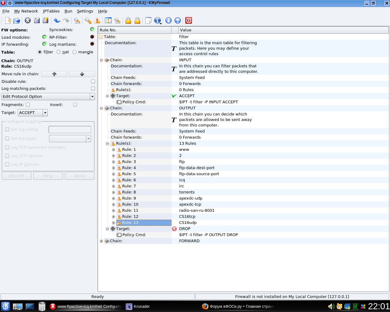 Причем тут же можно посмотреть в текстовом виде конфиг (при желании и руками потом править можно), запустить/остановить iptables.