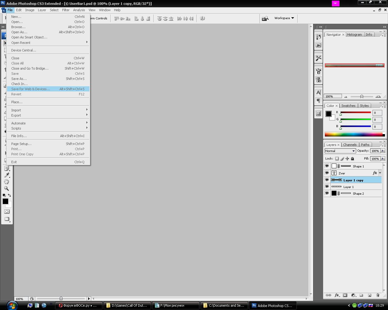 Crash писал(а):Я не могу сохранить файл ! Функция "File->Save for Web & Devices" напросто не доступна :