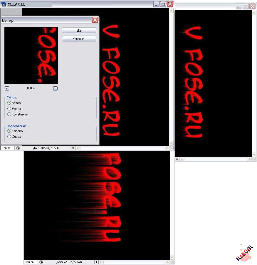 2. Переворачиваем его на 90CW (Image > Rotate Canvas > 90CW, Изображение > Повернуть холст > 90 по часовой), и применяем к нему эффект "Ветер" (Filter > stylize > Wind, Фильтр > Стилизация > Ветер). Далее нажмите Ctrl + F два раза, тем самым повторив фильтр Wind(Ветер) два раза.