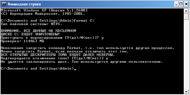 User писал(а):Прописал в командной строке format C: а он пише что он используется другим пользователем