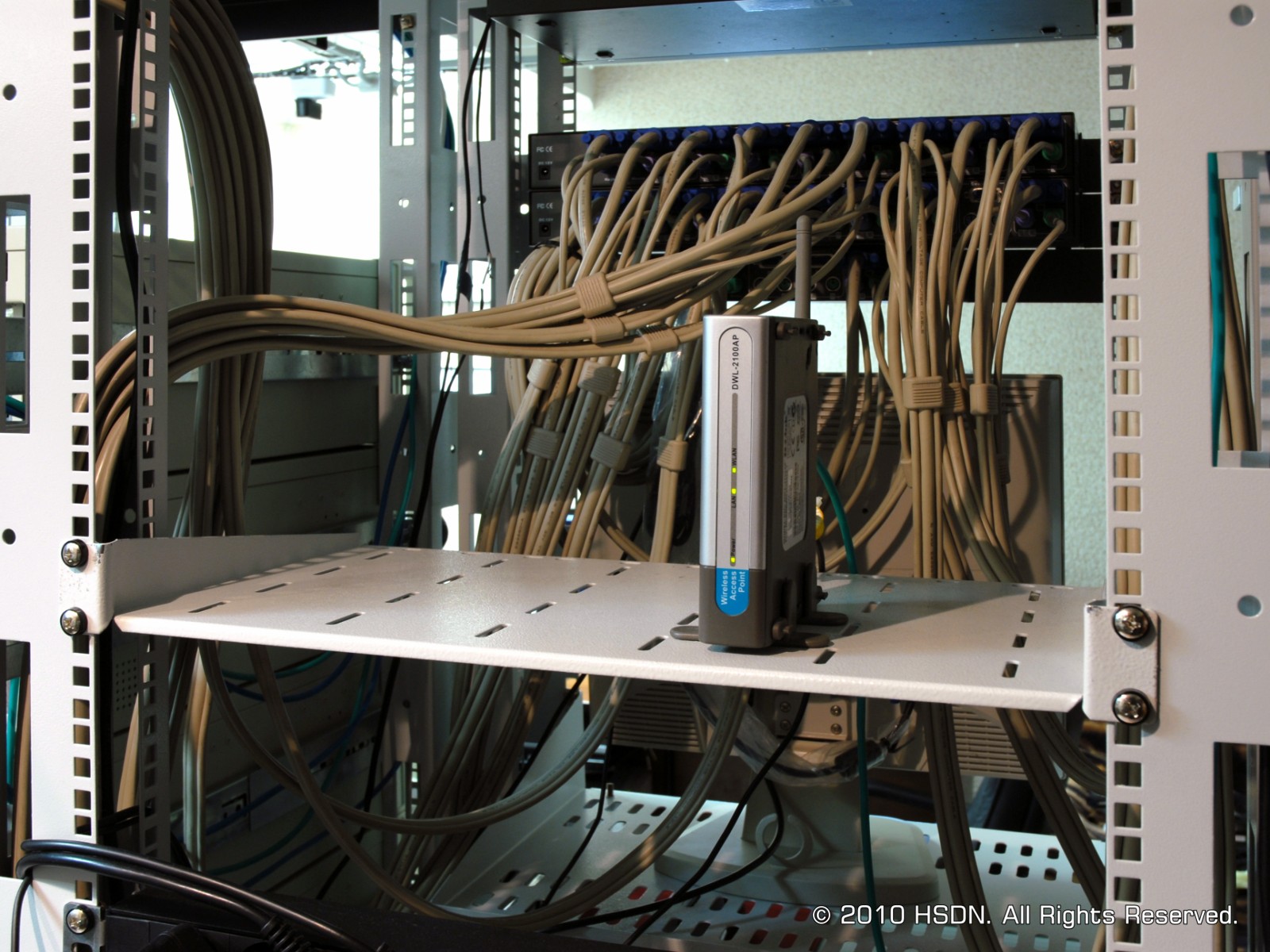 Для связи беспроводных устройств с сетью HSDN применяется точка доступа Wi-Fi, установленная в этой стойке. Позади нее можно видеть множество кабелей, отходящих от KVM переключателей. Каждый такой кабель подключается к какому-то серверу.