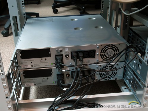 В той же стойке внизу можно видеть, как кабели питания серверов подключаются к ИБП.