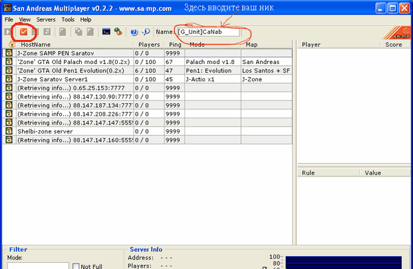 3. Запускаем клиент, нажимаем вверху, вводим свой ник (латинскими буквами), потом жмём на оранжевую галочку в левом в верхнем углу, вводим туда адрес сервера: