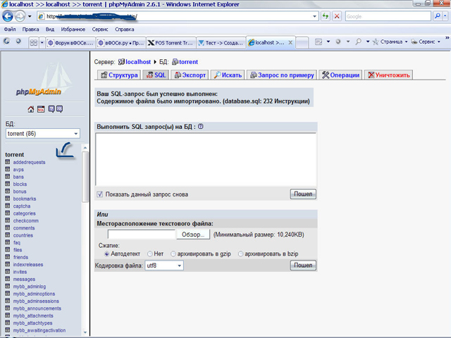 Теперь жмём SQL наверху нажимаем кнопку обзор и загружаем файл database.sql он находится в папке SQL вашего движка когда выбрали нажимаем кнопку пошёл ..