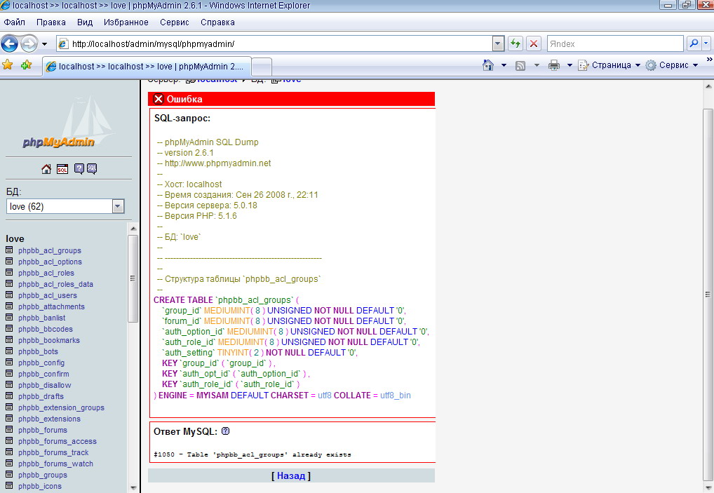 Он тебе говорит что такая таблица в бд love уже есть :)